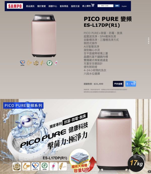 【聊聊再折】SAMPO 聲寶 17公斤星愛情PICO PURE變頻直立式洗衣機 ES-L17DP-R1